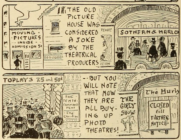 Lots to unpack here. A visual reference to the five cent nickelodeon admission (up to fifty cents) and the implication that theaters were being turned into girly shows. Wow. Obviously, theater survived the movies but you’d never know it from this cartoon.