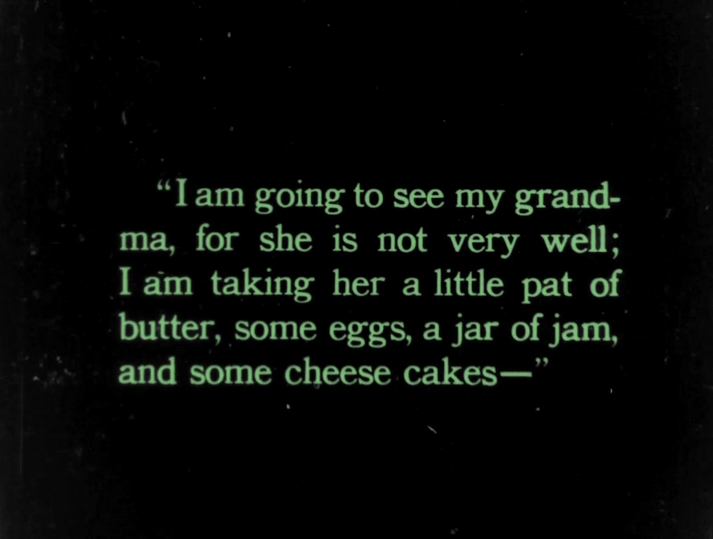 In the fairy tale’s title cards, Red tells the wolf exactly what she’s bringing to grandma.
