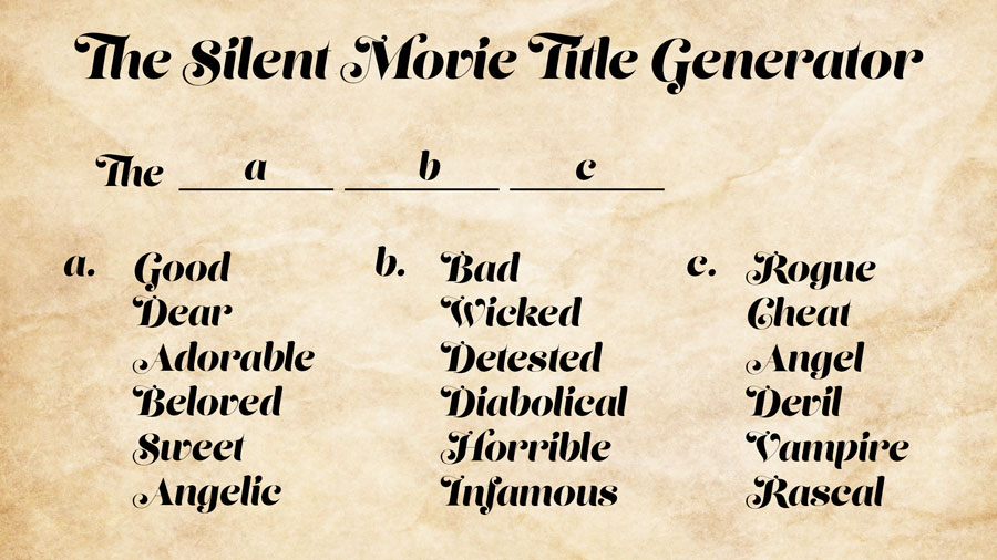 Inspired by the discovery of a wonderful Rube Goldberg cartoon about the movies, I have decided to make a Build-Your-Own-Silent-Title thingamee. Let’s have some fun!