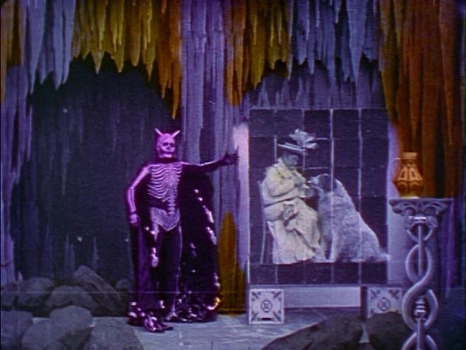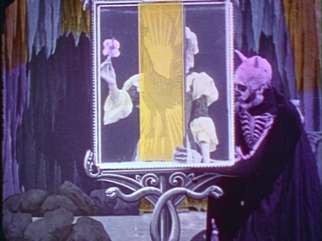 Obviously, as you can see from the screenshots, this film looks great and is a charming showcase for stencil color. In case you were wondering, stencil color is exactly what it says on the tin. Hundreds of young women cut tiny stencils—one for every color on every frame—and then color was applied to the film one print at a time. It has a handcrafted quality and, alas, some modern viewers complain about it in the mistaken belief that it was computer color added by a current restoration.
