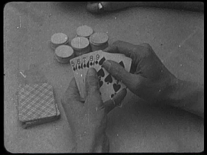 The direction of the poker scene is impressive for all the classic movie poker game elements that are present. In fact, if the scene were shot today, there would be relatively few changes needed. We have the antagonist with his pretty good hand, we don’t see what the hero has. A round of betting with neither man folding. What does Haskins have in his hand? Is it good enough?