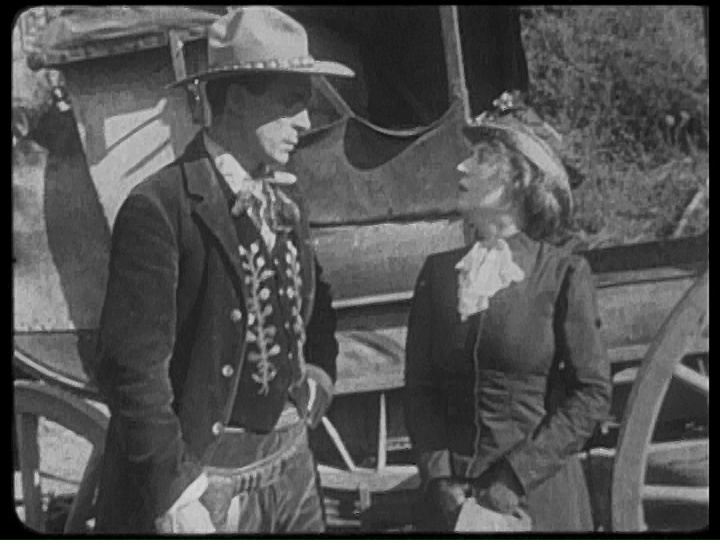 As it turns out, a straight flush beats four of a kind and Haskins emerges the winner. And this is where the one-reel cutdown diverges from the original two-reeler. Haskins doesn’t say anything to Priscilla about his win in the original version and so she leaves him a note telling him that he missed out and departs for the east. Haskins chases her down, takes her from the stagecoach and confesses his love.