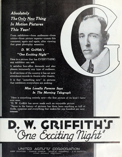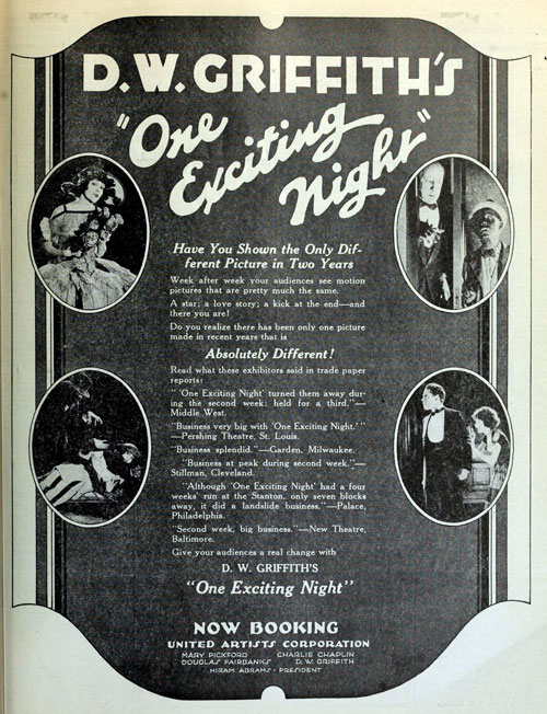 A search of trade periodicals reveals that other than re-release announcements (United Artists had a content shortage and did a lot of those), few pieces mentioned One Exciting Night in connection with the Old Dark House boom in Hollywood. I counted five direct references connecting the picture to another film in the same genre post-1923.