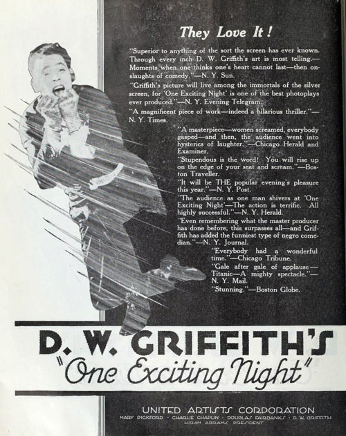 Fortunately, Thomas Cripps already covered One Exciting Night in his seminal work Slow Fade to Black and he points out that its use of blackface was condemned by the Chicago Defender, one of the top black newspapers in the United States the time, and that even a supporter of Griffith’s warned him by letter that the use of blackface stereotypes to ridicule would cause pain to black filmgoers.