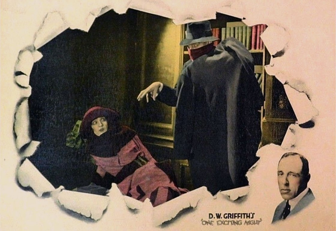 The mystery in One Exciting Night is two-pronged: What became of the people on the prologue and who is killing the cast? (Spoiler, I guess.) But the very grammar of storytelling gives the game away because if you show a prologue and then you show a bunch of new characters hobnobbing with the prologue characters immediately after, the audience will naturally assume that one thing connects to the other. And, in this case, it does. That baby born in Africa is Agnes and it’s no plot twist. And as for the killer, Rockmaine is the only character with opportunity and motive since Griffith cleverly gave just about everyone else airtight alibis.