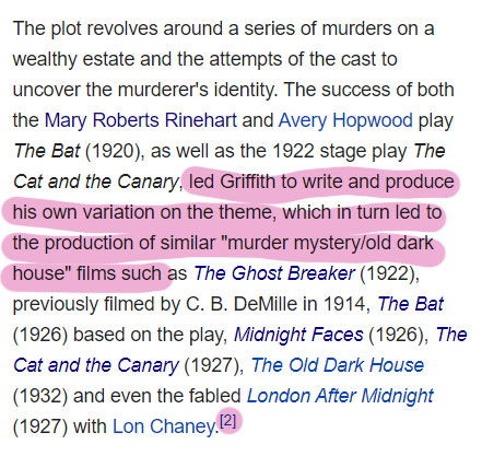 And if this was the case, why did they wait two, three, four years to do it? The Monster was adapted to the screen in 1925, The Bat in 1926 and The Cat and the Canary in 1927. Silent era studios were nimble and could shove out copycats in mere months.