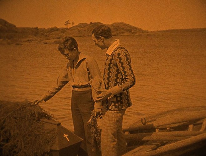 Before the Face of the Sea (Meren kasvojen edessä) starts out innocently enough. Three students, Kristoffer (Urho Seppälä), Pentti (Kaarlo Kytö) and Lassi (Ilmari Unho) are on a boating holiday during Summer Solstice when they spot a mysterious old man (Waldemar Wohlström) rowing along. Something doesn’t seem quite right and upon investigation, the students discover that the boat contains a coffin. (As well as an apparition of a dead woman that may or may not be entirely in the old man’s head.)