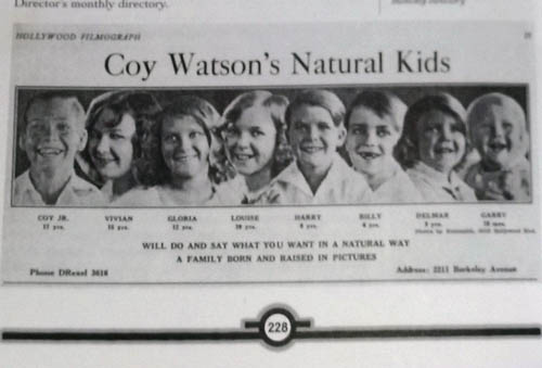 Coy Watson Jr. was the oldest of the Watson siblings and he made his acting debut in a Keystone comedy at the tender age of nine months! His siblings were (in birth order) Vivian, Gloria, Louise, Harry, Billy, Delmar, Garry and Bobs. Between them, the children appeared in over 1,000 films!