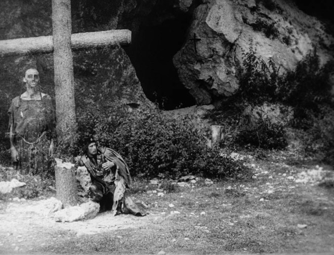 I should also point out that while the story is tragic, the film does not feel depressing or oppressive. Director Otto Rippert (who had directed Homunculus three years before) begins the film firmly grounded in the reality of the massive sets designed by Hermann Warm and Franz Jaffe. However, once Medardus is introduced, the picture takes a turn for the surreal with religious visions and hellish scenes interacting with reality. One could even go so far as to interpret the last part of the film as a fever dream on the part of Medardus.