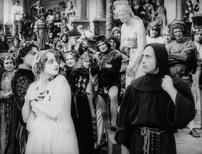 The status quo is shaken by the arrival of Julia (Marga Kierska), a courtesan who immediately catches the eye of nearly every man in Florence, particularly Lorenzo. The religious leaders fear that her beauty will allow her to gain a following and are disturbed when she openly states that the only god she worships is love. Cesare creeps into her chambers and attempts to rape her but is stopped by Lorenzo. When Cesare and his friends in the clergy attempt to arrest Julia, they are driven out by a mob and the city descends into a perpetual bacchanal with Julia and Lorenzo presiding over the festivities.