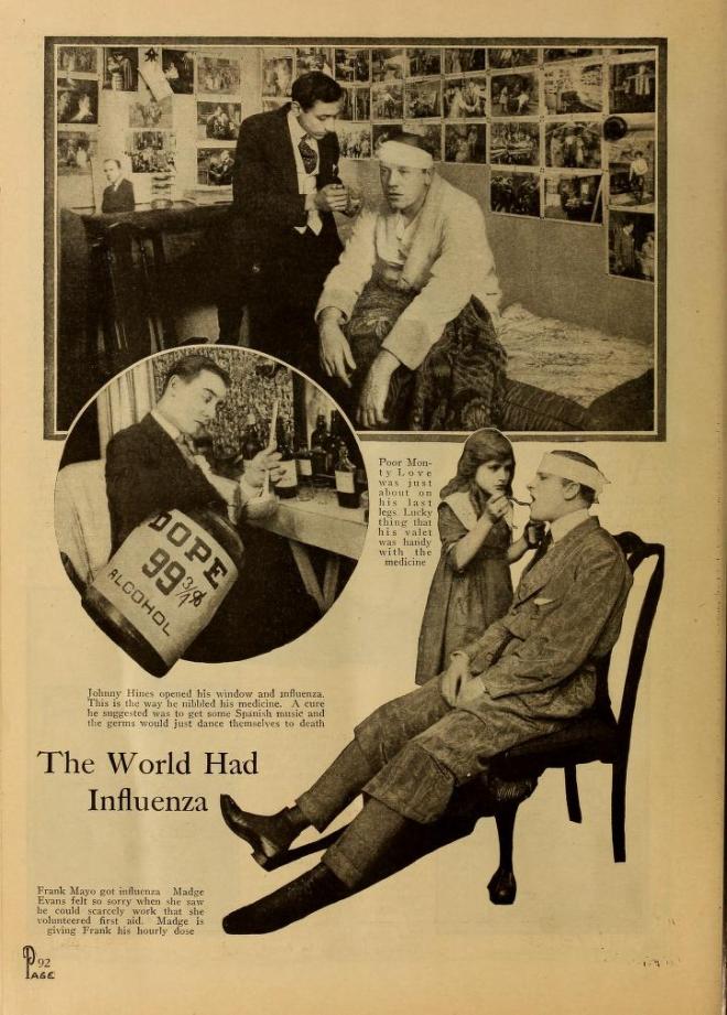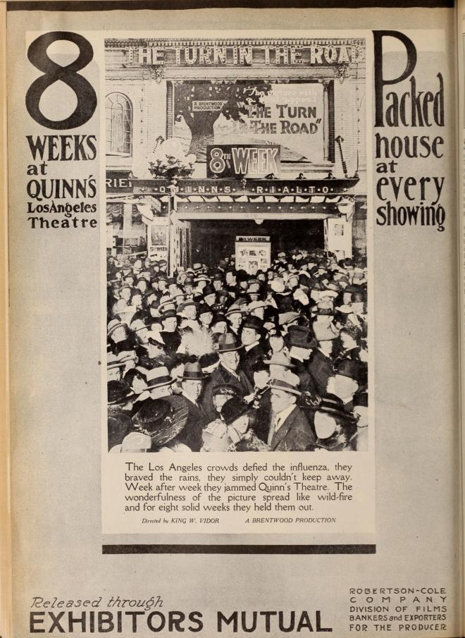 Certainly, the trade publications were full of influenza news, reporting which regions of movie houses were closed and studios assuring the public that their business was stable. The influenza was even used to advertise pictures with ads for The Turn in the Road bragging that audiences braved infection to see it.