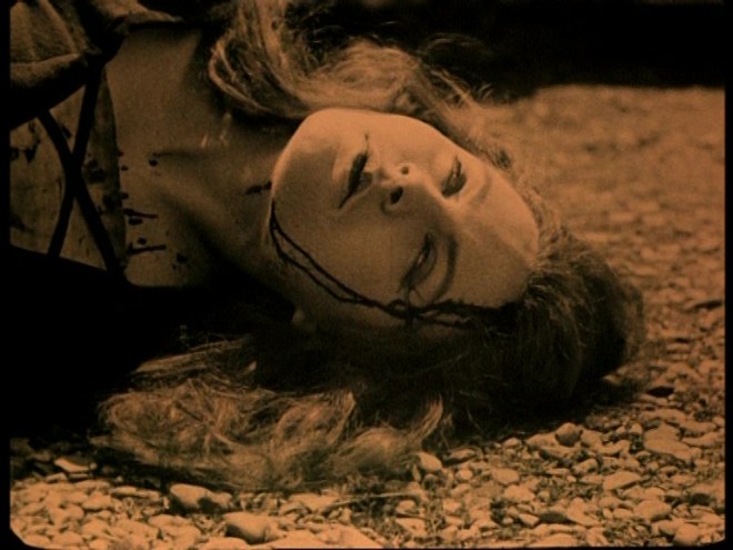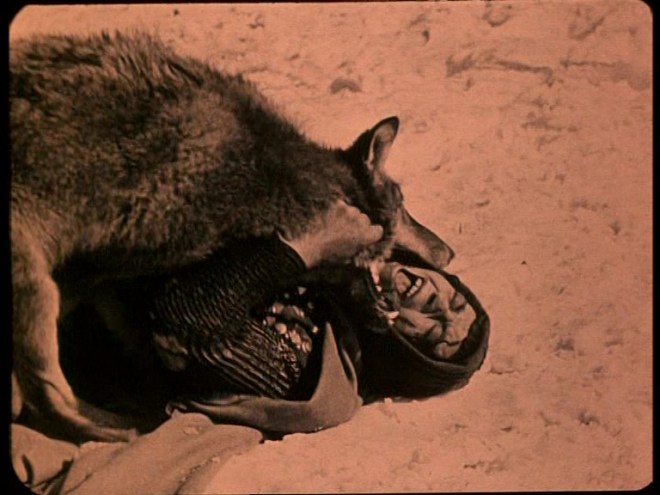 The king is in peril and his only hope is a letter that Jeanne must deliver but Châteauneuf is pursuing her through the snow with a band of armed men. (The suspense of her flight is aided by tracking shots and a handheld POV camera, which works, and undercranking, which does not.) He’s already murdered her father and means to seize both the letter and the young lady. Just when things couldn’t get any worse Jeanne comes upon a pack of wolves. It looks like the end but the wolves ignore her completely and attack Châteauneuf and his men instead.