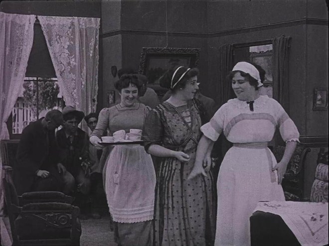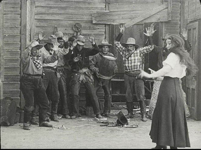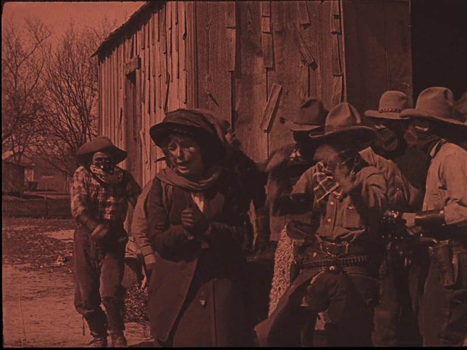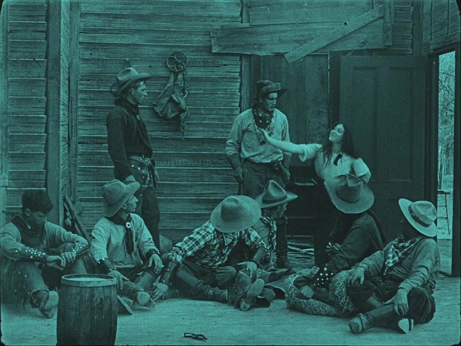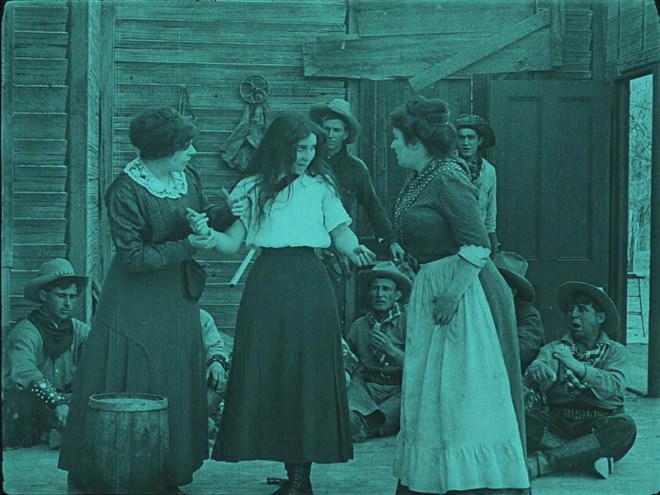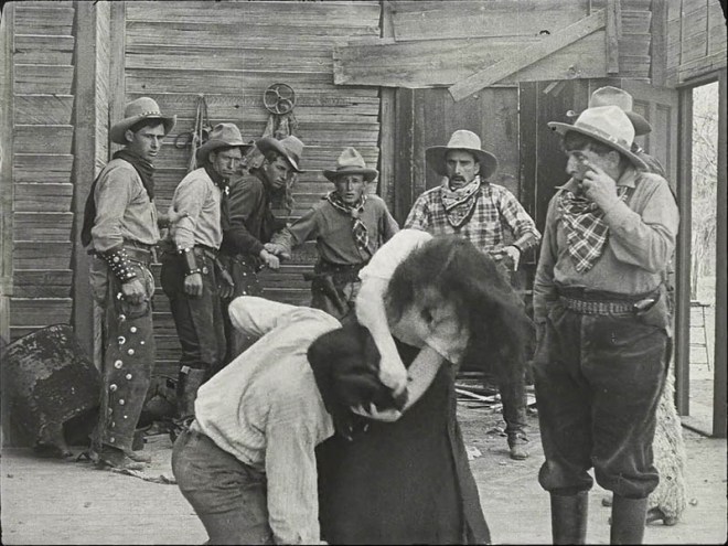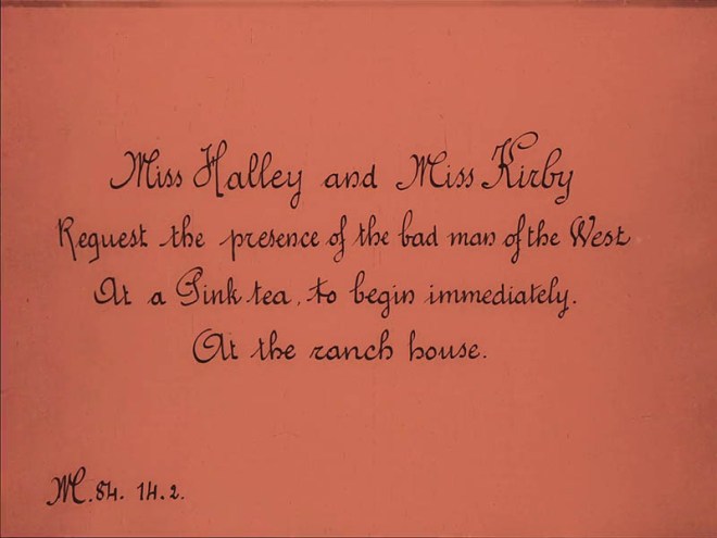Westerns tend to be a dusty, male-centered genre and so it is fun to see one in which the ladies not only take the lead but finish everything up by making the cowpokes clean themselves up for a frilly tea party complete with petit fours—and the cowboys are perfectly happy with this turn of events. This is just one of many examples of early films seeming to break the rules because they were made before the rules were firmly established. I, for one, would welcome more frilly tea parties in our western motion pictures.