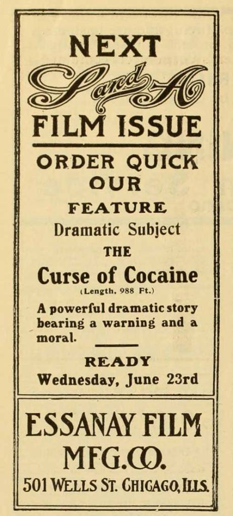 On the more sympathetic end of things, Essanay released The Curse of Cocaine in 1909. Of all the films I read about when researching this review, it is the one I would most like to see. It’s about the wife of a physician who is curious about cocaine and samples her husband’s supply. She descends into addiction, her husband discovers her condition and after some struggles with her cravings, she finally enters a sanitarium for successful rehab. From the descriptions, it sounds as though the wife is treated in a sympathetic manner and the message is one of treatment rather than condemnation. The film received rave reviews for its realistic settings, clever acting and superior photography and was declared to have high “art value.”