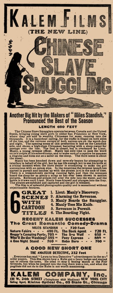 Selig returned to the topic in 1910 with The Smuggler’s Game, which was about Chinese immigrants and opium smuggling in California. According to a description in trade magazines “California is the country of best things, a semi-tropic land of enchantment, marred only by the threatening Yellow peril, carrying with it that demon cycle—opium—that lays the weird image of death in its wake and furnishes the plot of this great picture.” (Author’s Note: Yikes.)