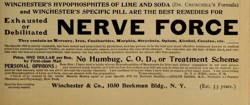Patent medicine was a cultural phenomenon in America during the nineteenth century and the ingredients were… pretty scary. The proprietary, non-prescription blends were almost entirely unregulated, heavily advertised and quite possibly poisonous—and were purchased by the gallon. In fact, a remedy ad from the time For His Son was released (after the golden age of quackery) boasted that its cure did NOT include “Mercury, Iron, Cantharides, Morphia, Strychnia, Opium, Alcohol, Cocaine, etc.”