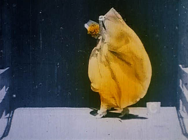 One of the aspects of Annabelle’s film that particularly charmed audiences was the hand-applied color. Hand-colored films were present from the very beginning and dancers were a particularly popular subject because the flowing costumes and movement would help to distract from any flaws in the color. As an added treat, Annabelle’s gown changed color from pink to yellow as she danced. (Sleeping Beauty, eat your heart out.)
