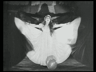 In 1894, Annabelle had been filmed by the Edison film company in their cramped Black Maria studio—you can see the walls of the tiny thing on the sides of the frame. Her dance was initially intended for peepshow distribution, which was the way movies were commercially distributed at the time.