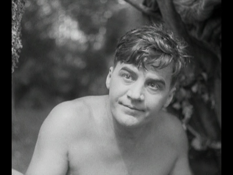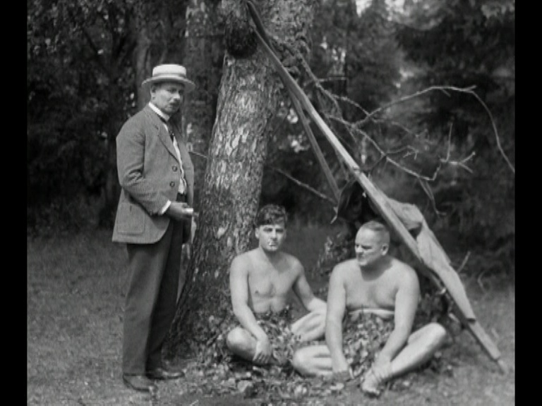 After our unfortunate vacationers don leaf kilts, Paavo goes ahead to explore and spots Vikström (Uuno Montonen, giving off a fun Mack Swain vibe), a bandit on the lam. Paavo doesn’t know this, of course, but Vikström is surly and attacks him with a knife. Our robust soldier makes quick work of the bandit (the accompanying title card “Knockout!” cracked me up) and decides to help himself to the latter’s clothing. (Wink, wink, wink!)