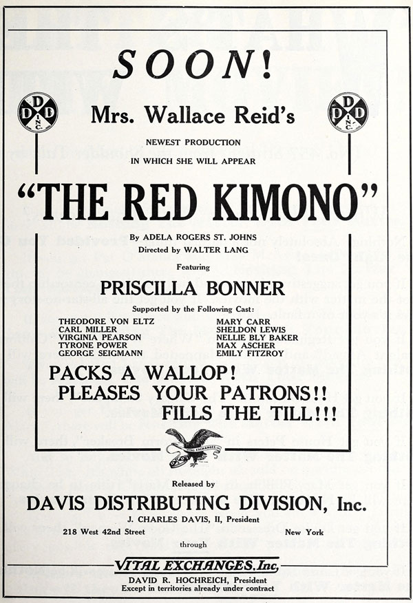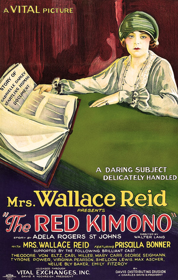 Davenport billed herself as Mrs. Wallace Reid. Her movie star husband had died due to his morphine addiction. The grief-stricken Davenport felt compelled to make a movie about the tragedy of addiction, the lost picture Human Wreckage. She followed it up by acting in and producing Broken Laws, which condemned parental indulgence and was based on a story by Adela Rogers St. Johns.