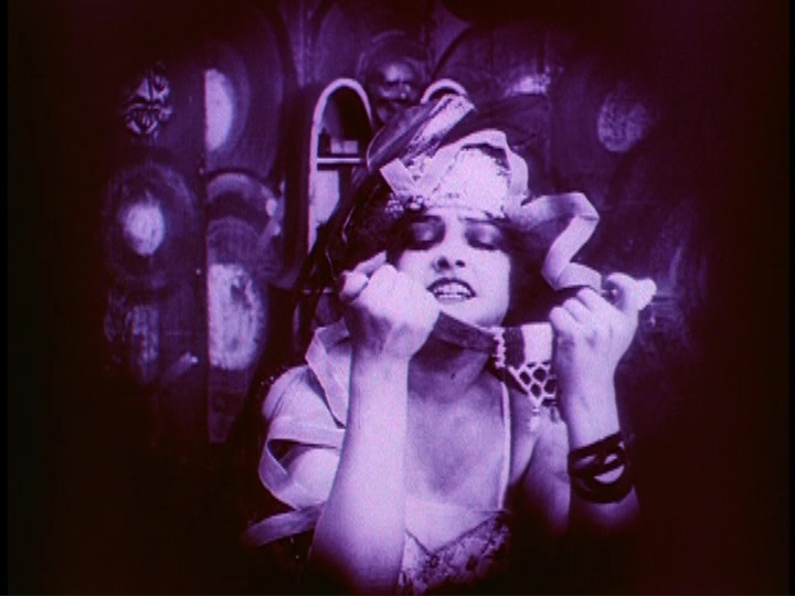 Genuine (American acrobat-turned-actress Fern Andra) is a peaceful priestess who is kidnapped and sold at a slave market. Due to the trauma of her ordeal, she becomes cruel and violent. She is purchased by a rich aristocrat (who looks suspiciously like the art buyer from the prologue), who takes her to his mansion, sets her up in a greenhouse cage and dresses her in outré lingerie. Because he is rescuing her and keeping her safe. Mm-hmm, yeah, riiiight.