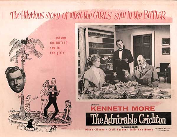 The highlight of the picture is Diane Cilento as Tweeny, a cute little working class maid who enjoys the not-so-fine things in life, like a pub lunch and a free concert. She comes off as so genuine and appealing that Kenneth More’s Crichton has a hard time justifying dumping her for Mary. Tweeny comes off far less piteous in this version as she is the object of desire for all the aristocratic gents on the island, just as Crichton is the most eligible bachelor among the ladies. Sally Ann Howes isn’t bad as Mary but the film never properly establishes what her appeal is beyond being forbidden.