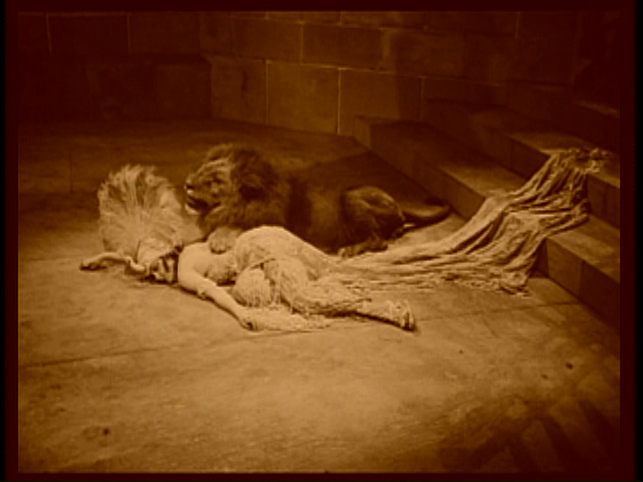 The Henley poem was meant to be taken literally as Crichton and Mary discover that they had lived before in Babylon. Crichton, as king, demands Mary’s love and when she refuses, he feeds her to his lions. The lions are kept in a convenient pit in the throne room for the purpose. Swanson was obliged to lie underneath a trained male lion and play dead. Yikes. (DeMille was later furious when Victor Mature declined to wrestle a toothless lion in Samson and Delilah. Perhaps he should have cast Swanson.)
