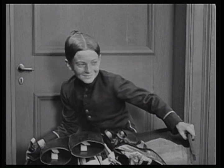 Whole I am not sold on the movie in general, there are some very nice touches that I would like to draw attention to. The film opens with a clever sequence in which a young servant (Wesley Barry) peeps through the keyholes to watch various members of the Loam household awaken.