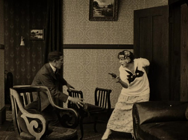 Lack of logic notwithstanding, the reason why this twist works so well is because plays perfectly into the popular view of what silent movies must have been like. A virginal heroine threatened with a Fate Worse Than Death at the hands of a slick lady-killer? Like, every silent movie ever, amiright? And then, BOOM! Our leading lady is engaging in gunplay and fisticuffs with the villain.