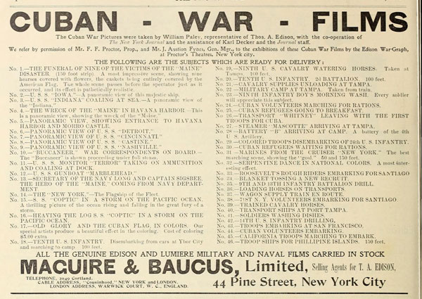 During the early days of cinema, demand outpaced supply by a fair amount and, as the political crisis in Cuba deepened, the Edison motion picture company saw an opportunity to generate some much-needed new releases. Branding itself as the Edison War-Graph and advertising “CUBAN WAR FILMS” in bold block type, the company built its market share and aided in the propaganda efforts at the same time.