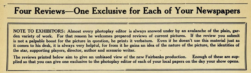 The marketing kit openly states that “If the review you submit is not a palpable boost for the picture in question, he [the editor] prints it verbatim.” Smuggling marketing copy into print under the guise of an independent review and obtaining free advertising for the studio was hardly unexpected in the age of hoopla and other film studios engaged in similar antics but it is amusing to see the plan talked about so frankly.