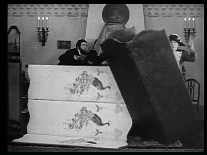 Fairbanks also indulges in the macabre humor so typical of his modern productions, which was generally left out of his swashbuckling pictures. For example, in Flirting with Fate, while in the throes of despair, his character hires a hitman to kill him and then has to try to cancel the contract once his life takes a turn for the better. In The Nut, Fairbanks steals some dummies to pose as rich magnates (long story) but passersby assume that he is a murderer trundling along with the corpses of his victims. And, as stated earlier, Fairbanks himself poses as a corpse to fool the police earlier in the picture.