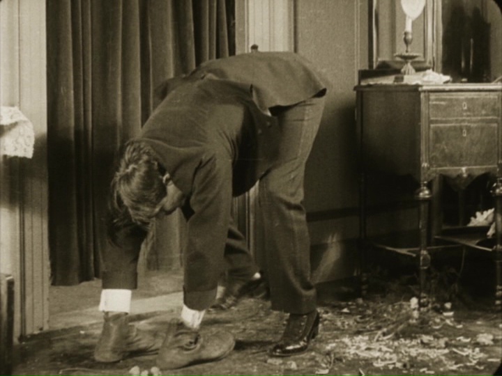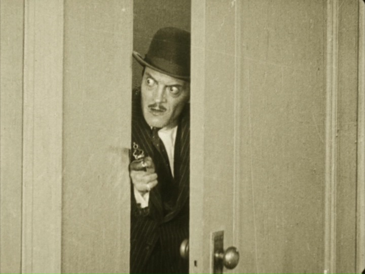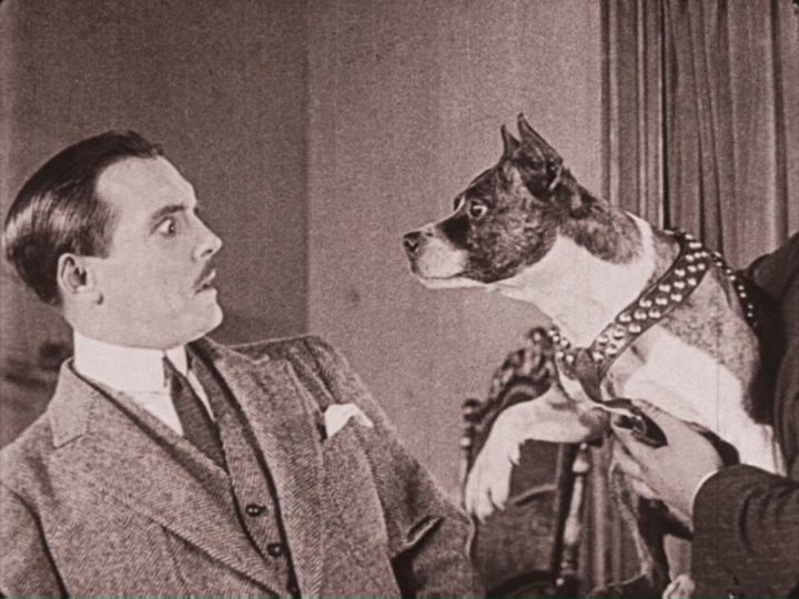 Be My Wife is in the curious position of being fairly famous and simultaneously unseen. You see, a fifteen-minute excerpt of the film has been circulating for years. In these scenes, Linder tries to get rid of a romantic rival by faking a burglary and pretending to fight off the intruder by himself. Linder wears shoes on his hands so that the people on the other side of the curtain will think he is toe-to-toe with the criminal. A horrific fight ensues, only to be prematurely ended when an enthusiastic dog named Pal gets in on the act.
