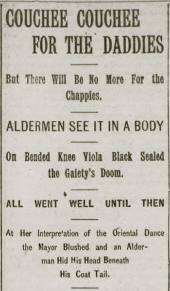 The dance was banned in multiple locations, a 1903 exhibition in Kansas City, Missouri promised a replacement act that was “equally interesting but not at all improper.” In 1907, the Chicago Examiner condemned the “obscene posturing that accompanies the danse du ventre.”