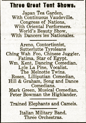 A comfortable audience gathered, composed of deacons, their wives and families, young men and maidens. The lights were turned low, and then, it is said, there flashed upon the canvas two rounds of a regulation prize fight, with its cross-counters, straight arm jabs, uppercuts and clinches. Of course everyone was horrified; but this wasn’t a circumstance, for the next instant a skirt dancer was pirouetting before the eyes of the elect, displaying numberless yards of silk and plump feet and ankles. A shiver of horror permeated the atmosphere when with dazzling distinctness one of those naughty couchee-couchee dancers from Cairo wriggled across the canvas. This was followed by a horse race upside down, and the deacons made a rush for the operator, while it is said a blush that almost lit up the edifice ran around the room. It was then that the operator remarked that he was giving that show and he proposed to proceed with it. It is also alleged that he had stopped several times while en route to the town. The spectators were loath to let any of the exhibition matter out, but gradually the facts are coming to the surface.”