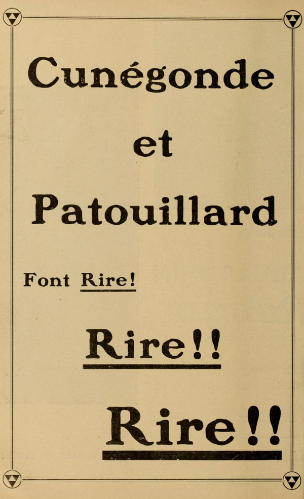 In the years leading up to the First World War, any French studio worth its salt had a regular comedy series in production—or several. Just to list a few, Pathé had Max Linder, the undisputed international king of comedy, Gaumont had Bout-de-Zan and Onésime, and Lux had Cunégonde and Patouillard.