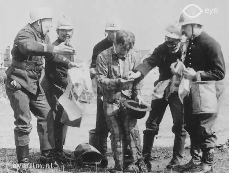 All ends well when Patouillard manages to sell the firemen copies of the newspaper he kept safe in his clothing. Cash in hand, he wanders off to his next adventure.