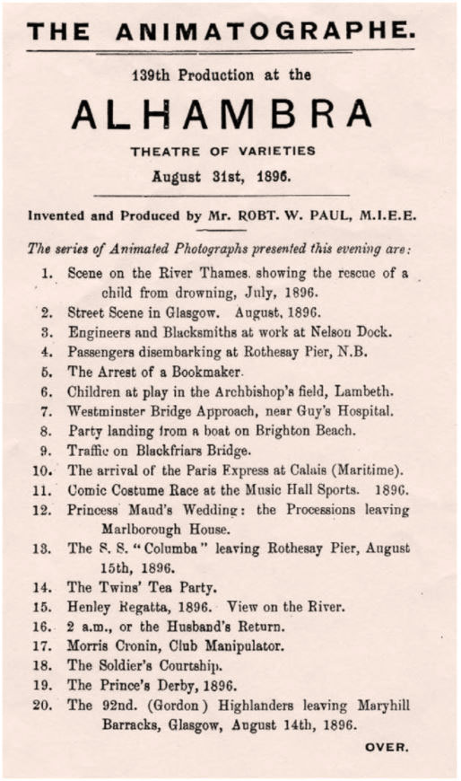 (Incidentally, Paul’s music hall program was made up primarily of actuality footage but it also included fictional shorts like The Soldier’s Courtship, possibly the earliest British fiction film, and The Arrest of a Bookmaker. The Twins’ Tea Party could be a true actuality but the children behave as though they are being coached off-camera, so it could possibly be considered a precursor to docufiction.)