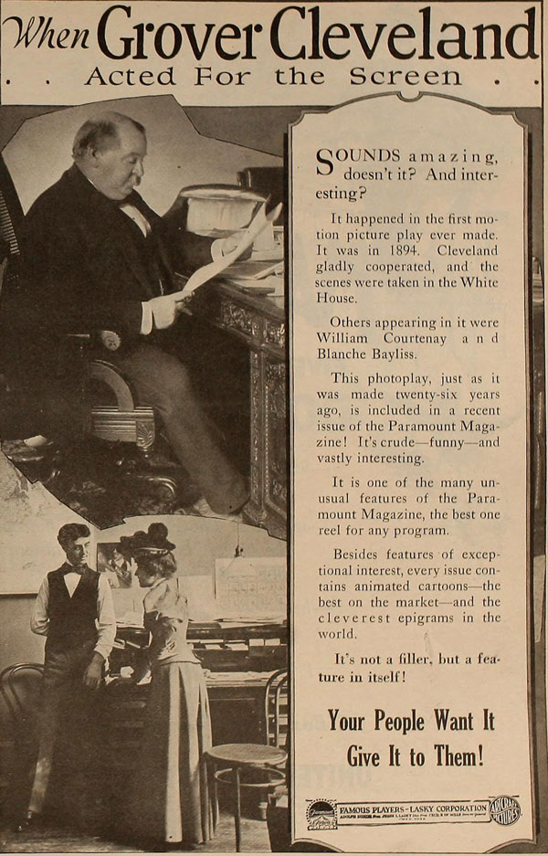 A good deal of confusion about this seems to be rooted in the show’s 1920 reissue by Paramount. An advertisement read “When Grover Cleveland Acted for the Screen.” Paramount also promised that the presentation was “crude, funny and vastly interesting” without specifying that it was a slideshow.