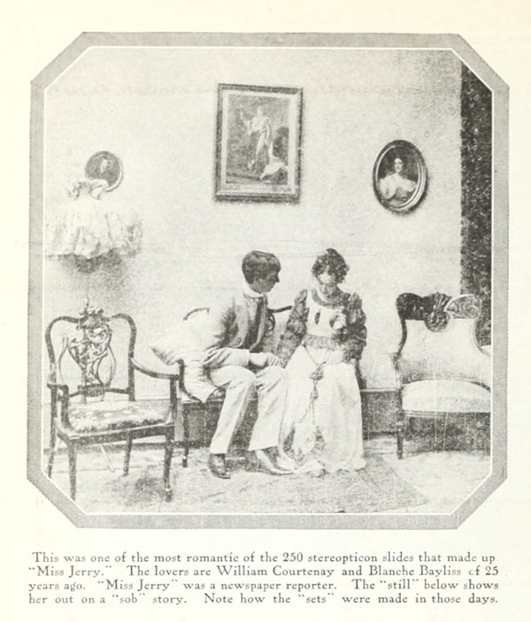 A Capital Courtship was the work of Dr. Alexander Black and it was a series of stereopticon slides, which could fade into one another to create an illusion of movement. Black’s presentations were particularly sophisticated with a large number of images. Black was keenly aware of the limitations of the medium and took care to avoid, say, duels, which would expose the artificiality of the fade.