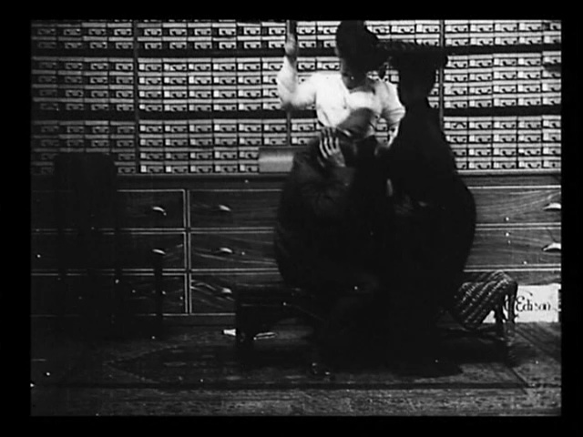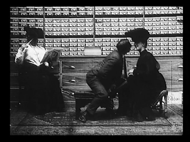 In addition to its voyeurism, The Gay Shoe Clerk combines several popular plots in early film: the clandestine flirtation, the kiss and the slapstick beating. A young couple just trying to steal a little sugar only to be met with a violent guardian was hardly an invention of the cinema but these plots were easy to communicate visually and were therefore popular.