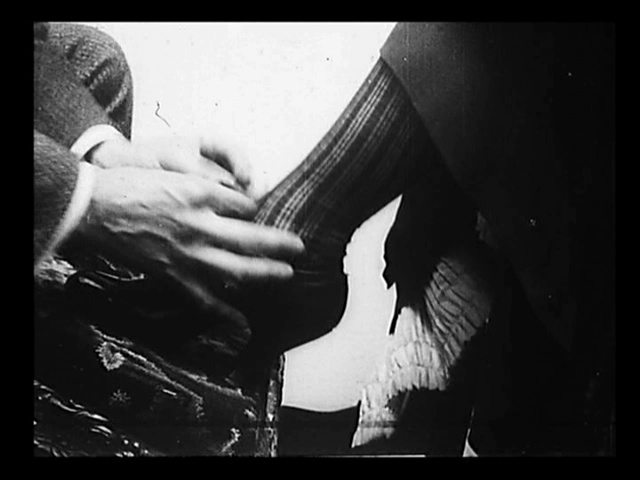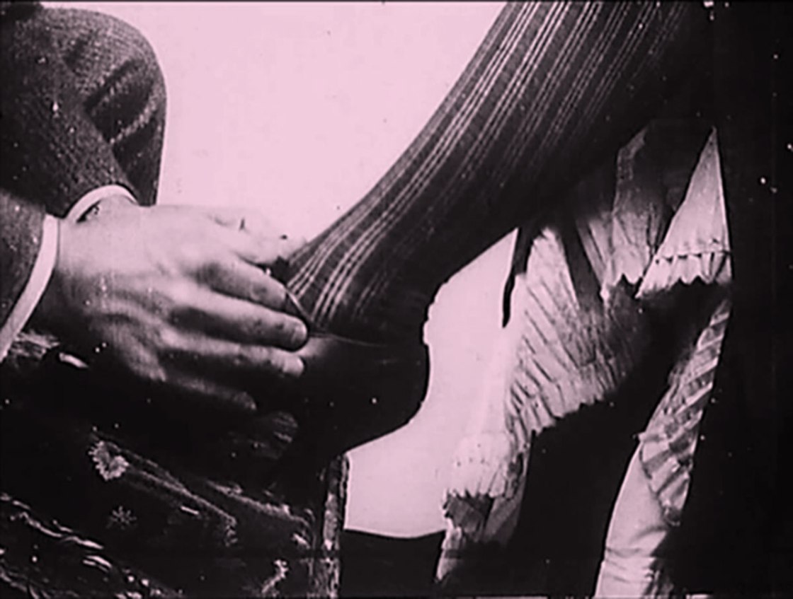 From a technical perspective, the main subject of interest is the insert closeup of the woman’s ankle. Closeups are considerably older than many people realize and were being used for narrative, humor and titillation during this period. (There’s some scholarly debate as to whether the shot in The Gay Shoe Clerk is narrative or an attraction meant merely to showcase the ankle. I’m kind of in the “Why not both?” camp.)