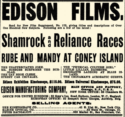 “The Gay Shoe Clerk” is fun to watch. I see “Shamrock and Reliance Races” in the ad. That would be the 1903 America’s Cup where Reliance beat Sir Thomas Lipton’s Shamrock III. Sir Thomas challenged for the cup five times between 1899 and 1930. Each of his boats was named Shamrock. He lost every time. I would have tried a different name on the boat.