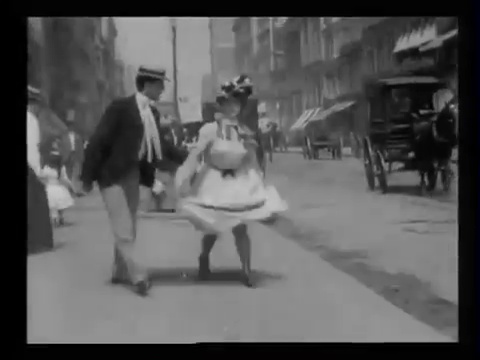 To that end, peepshow and naughtier fare was a staple of cinema and a bestseller for the Edison film company. Annabelle’s ankle-revealing dances were among the studio’s first projected hits and set the tone for what was to come. Porter’s 1901 film, What Happened on Twenty-third Street, New York City, is an ersatz Candid Camera affair in which a young woman walks over a sidewalk grate and her skirts blow up to her knees, revealing calves and ankles alike in a manner usually associated with Marilyn Monroe. (It’s possible that the young lady was played by a male Edison employee in drag, as was the case in The Gay Shoe Clerk.)