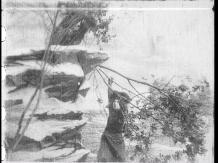While Blackton did not credit either Wilkins or Nobles (copyrights and licensing for film adaptations were still very much the wild west), audiences of the time would likely have made the connection to the still-popular Nobles film. The fact that And the Villain Still Pursued Her ends with the same cliffhanger as both play—the young heroine precariously hanging from a tree branch—makes the connection quite clear. Of course, in the film, the branch actually gives way under the villain’s trusty saw, which creates a visual echo of the author dropping back down into his flat and waking up from his dream.