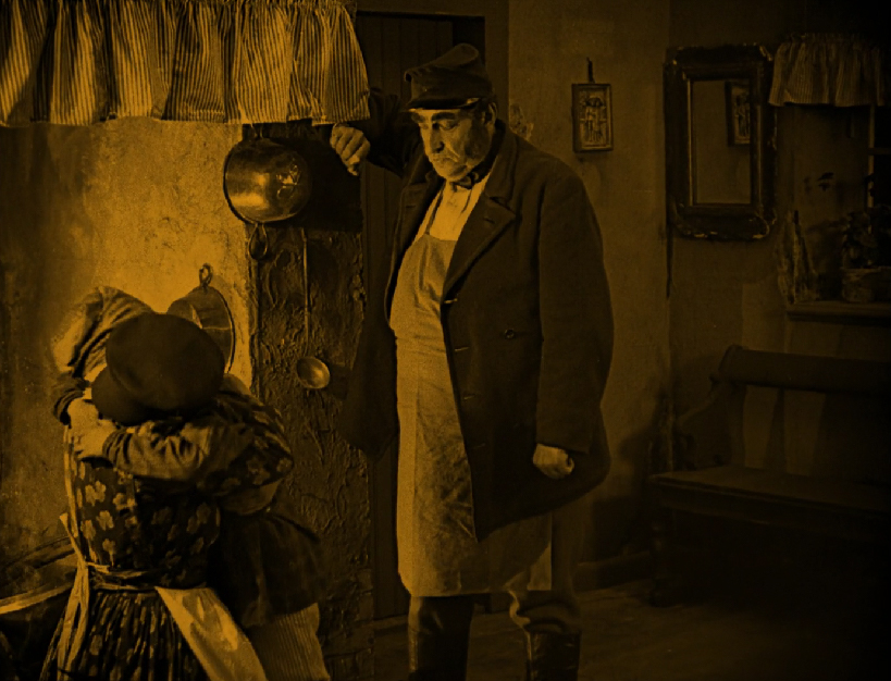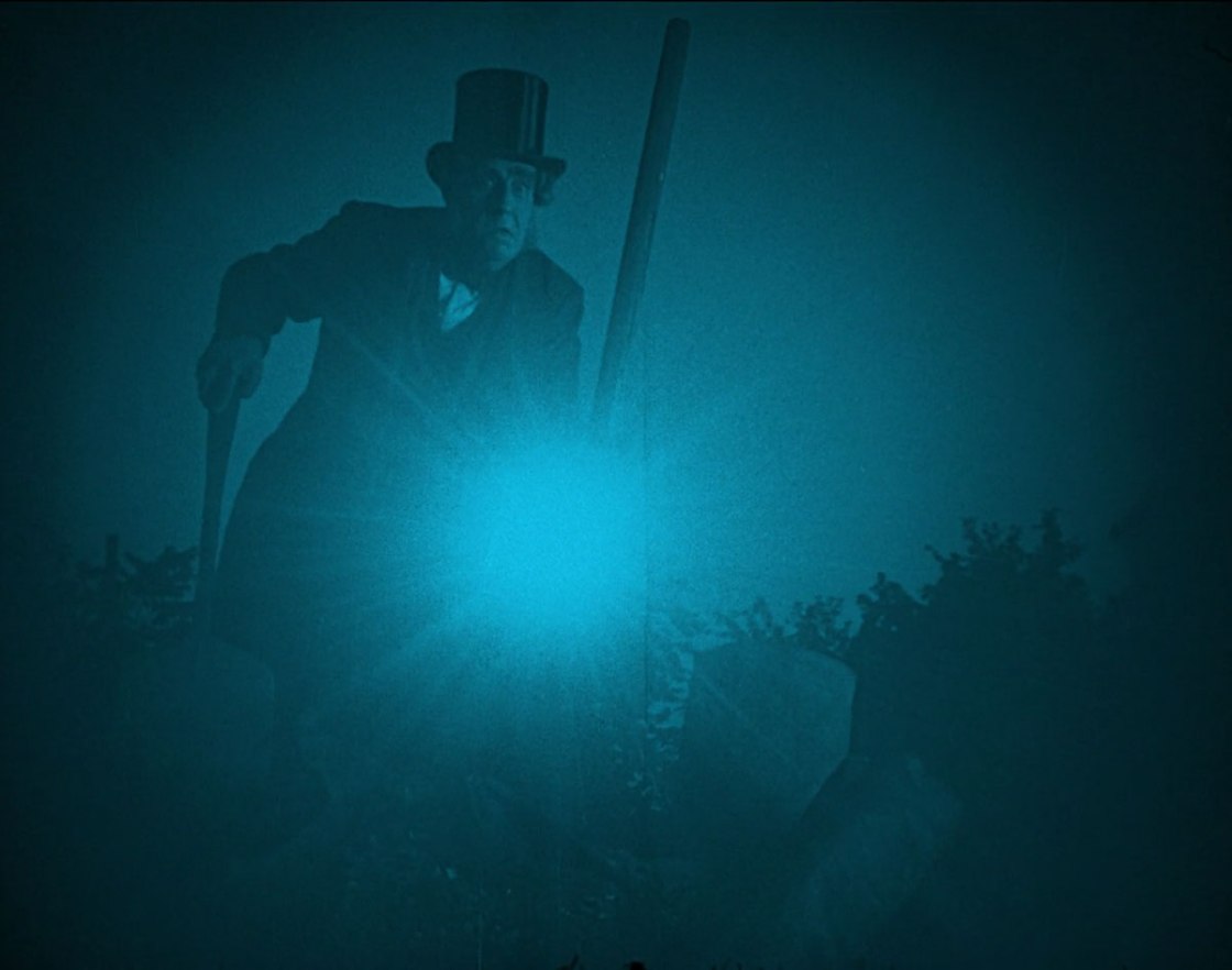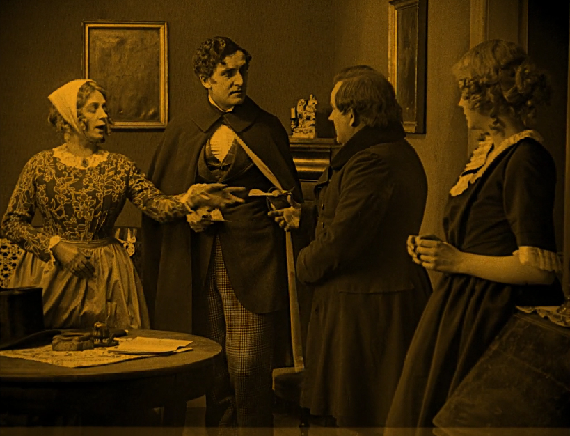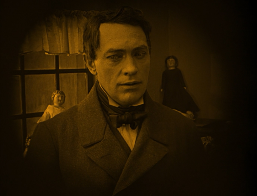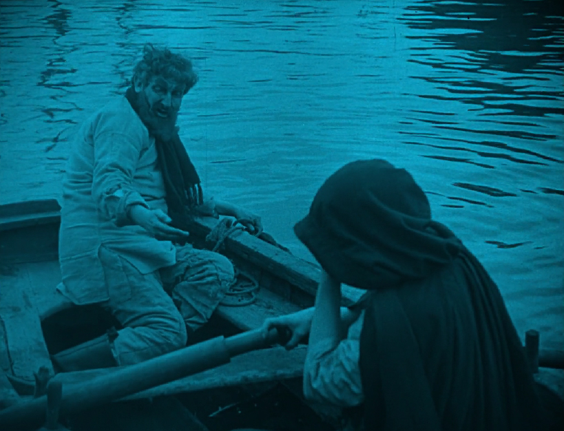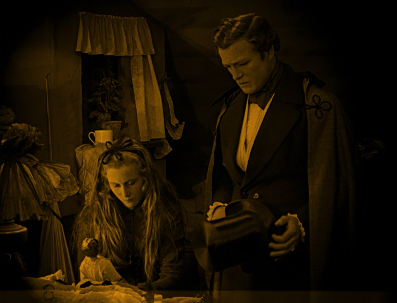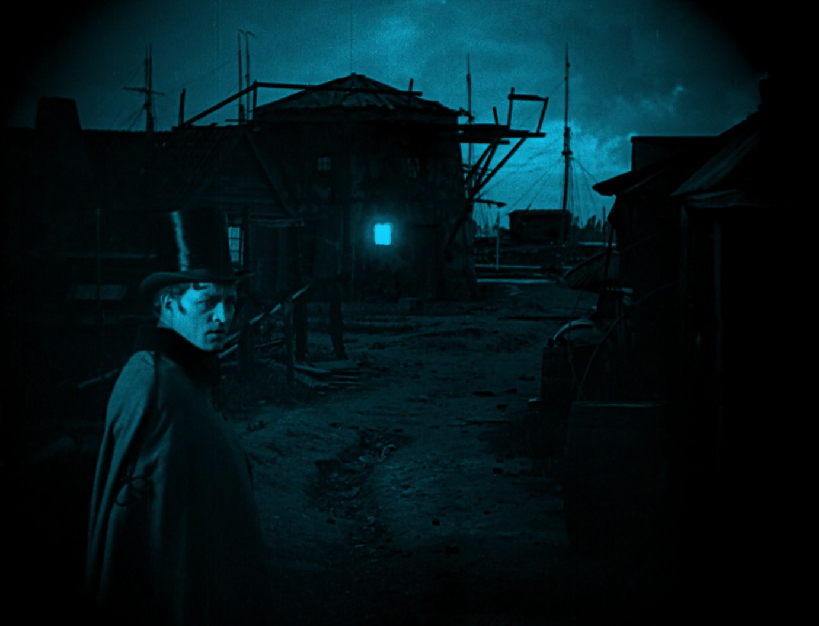 This film focuses on the characters and the story, it’s not out to set the world on fire with ostentatious cinematography but there are some extremely effective moments. Dramatic shots of the old Harmon place overlooking piles of garbage, moody lighting in the various holes and hovels, and an extremely good murder scene that makes use of gold and blue tints to communicate a light being snuffed out. There’s also a very modern shot when Silas Wegg is introduced. The camera focuses on his wooden leg (an important plot device) and then pans up to show us the whole man. Standard practice today, uncommon in 1921. (More typical would be an iris shot of the leg and then cut to a medium shot of the man.)