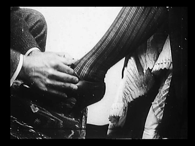 The feminine leg was a familiar element in early film and a popular subject for the newfangled insert closeup (closeups themselves were an old hat, closeups edited into the picture were the innovation). One of the earliest known insert closeups, George Albert Smith’s As Seen Through a Telescope (1900), shows a woman lifting her skirt in order to have her shoelace tied. A similar shot was used in Edison’s own The Gay Shoe Clerk (1903). It should be noted that the latter film featured male Edison employees in drag.