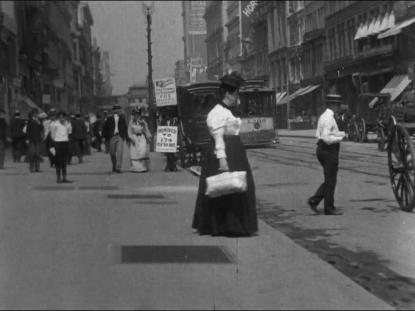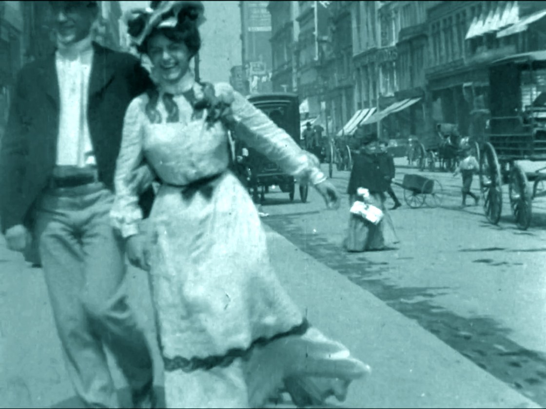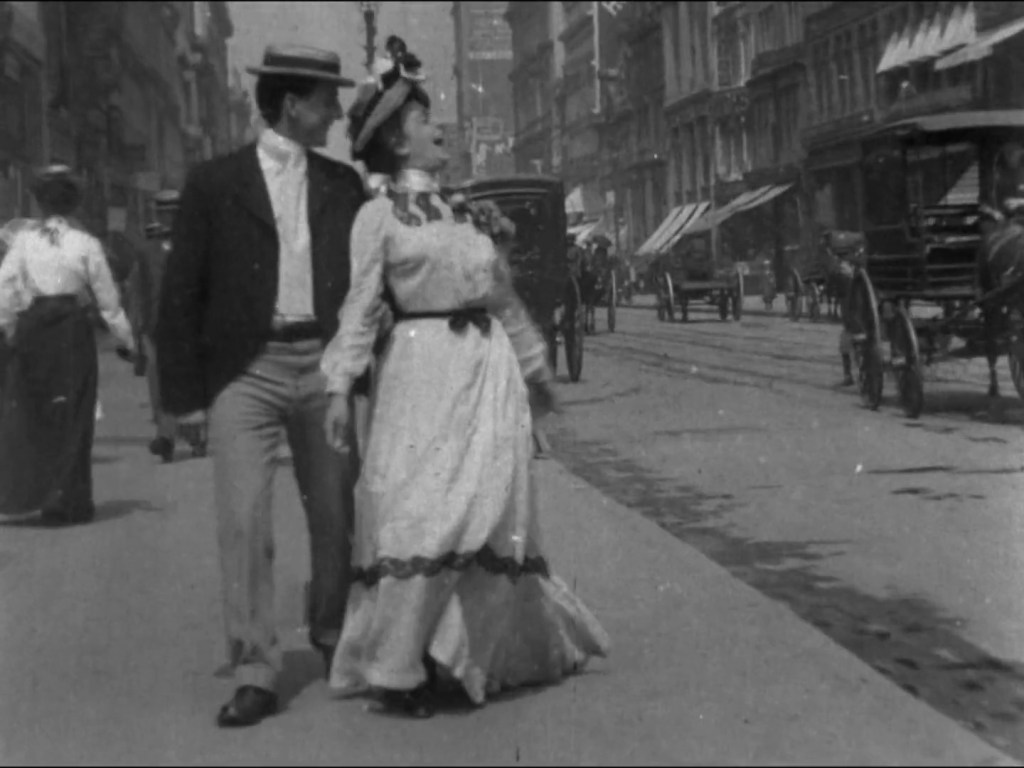So much great 1901 urban action happening in the background here! (Also, can’t believe anyone would think this was unplanned–the couple very cooperatively slow their pace to a near stop over the air shaft)