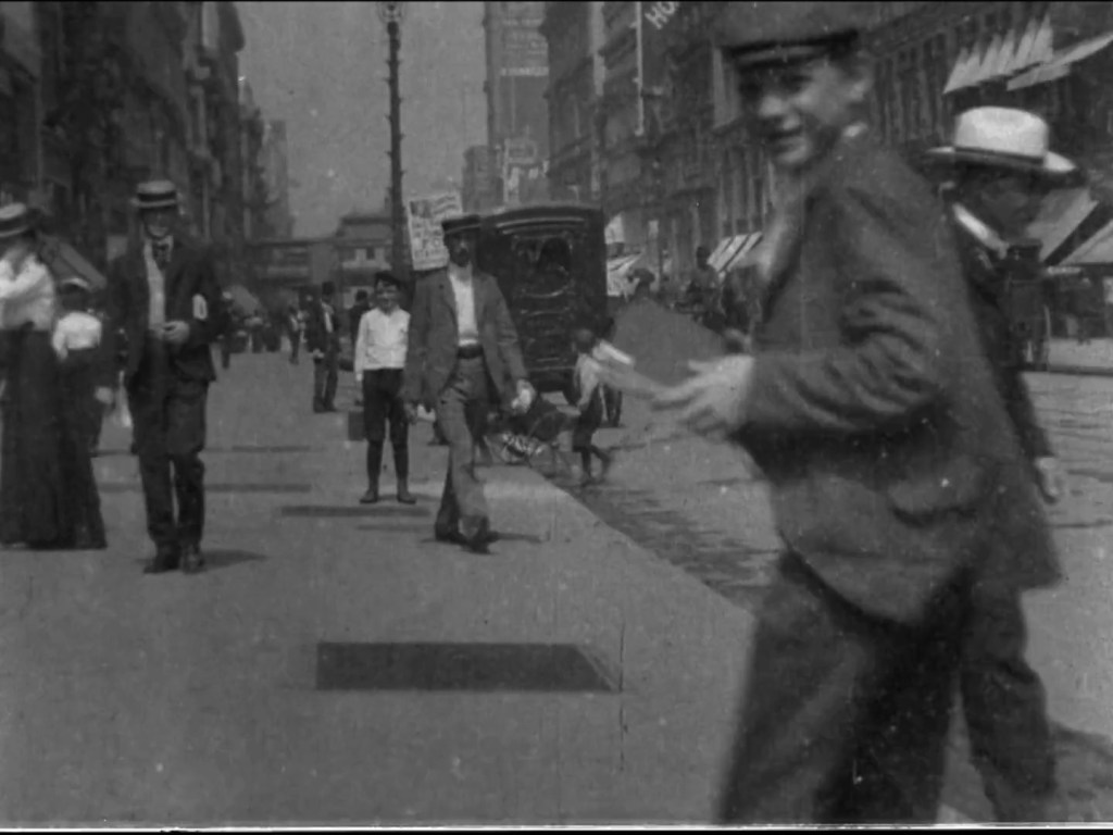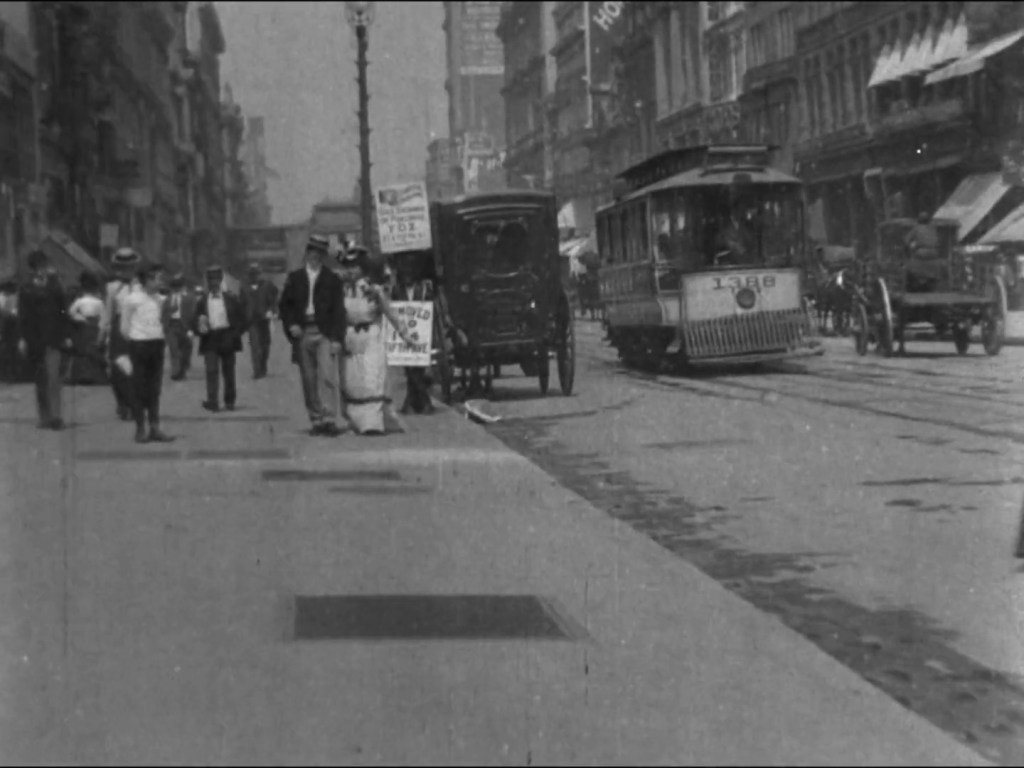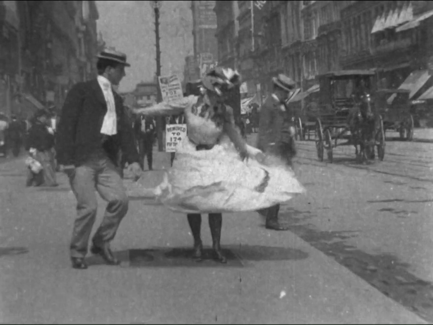 It stands to reason that the skirt flip of What Happened on 23rd Street would have been planned. After all, Edison ran on a tight budget and a camera crew couldn’t expect to stand around all day waiting for the ventilated skirt shot they wanted—and since the average New Yorker likely knew what a movie camera was in 1901, a woman caught on film might react badly to her mishap being recorded. (Those hat pins were sharp!) Much easier and less risky to simply engage the services of an actress who did not mind displaying her gams.