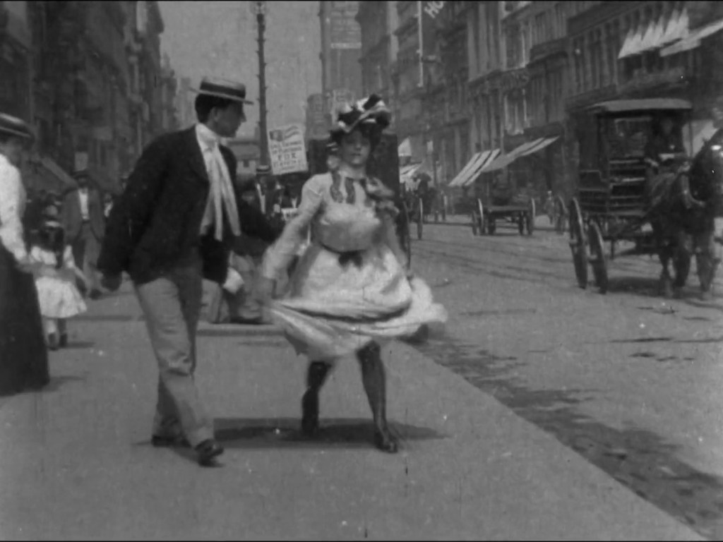 The film runs a bit over a minute and seems to be a street scene of New York City but then a young couple approaches the camera and walk across a grate on the sidewalk—and an air shaft blows the woman’s skirt up to her knees as she giggles for the camera.